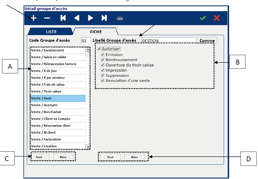 Le droit d’accès permet de donner un accès personnalisé (avec des autorisations et des interdictions aux utilisateurs de CashOffice).