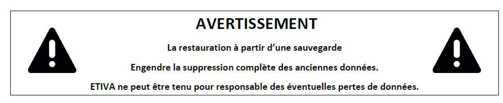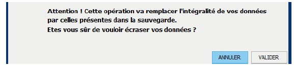Les données d’un fichier précédemment sauvegardé vont remplacer l’intégralité des données de CashOffice.- Au premier message d’avertissement, cliquer sur le bouton « valider ».