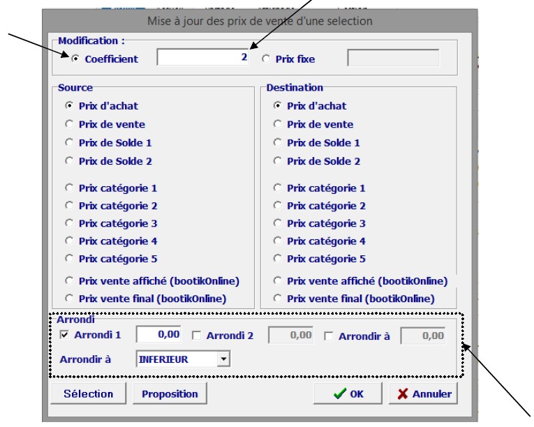 Exemple : tous les articles très anciens à 29 € - Par coefficient : la destination aura un prix proportionnel à la source, le calcul est le suivant :