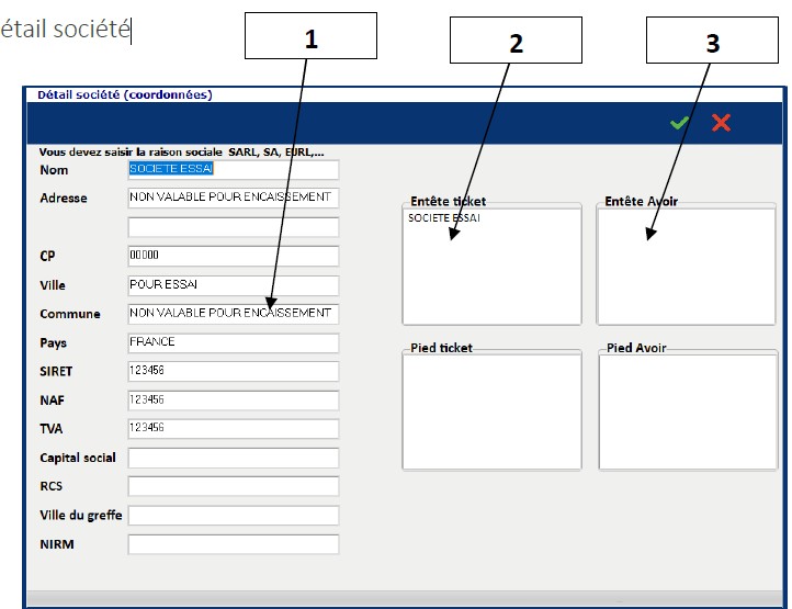 - Entête et pied de ticket pour les tickets de vente, bon d’achat et arrhes