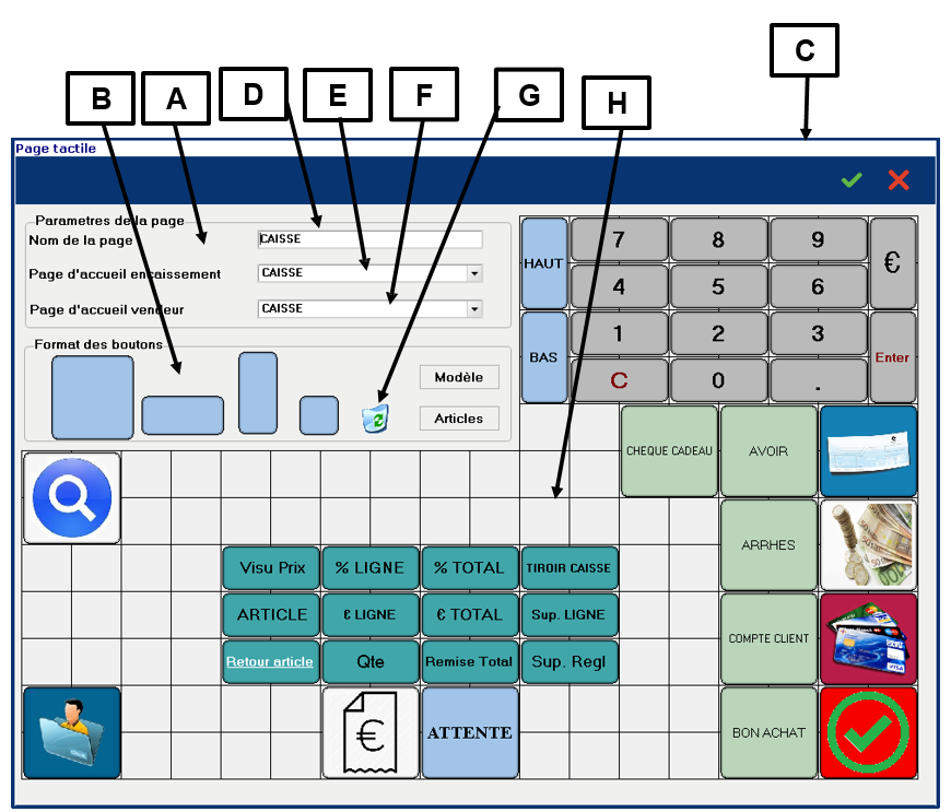A. Présentation B. Description [A] Zone des définitions [B] Zone Format des boutons tactiles [C] Zone représentant l’encaissement [D] Nom de la page tactile en cours (ou à enregistrer) [E] Définition de la page tactile d’accueil principale [F] Définition de la page tactile pour la saisie des vendeurs [G] Corbeille de suppression [H] Quadrillage de placement de bouton tactile
