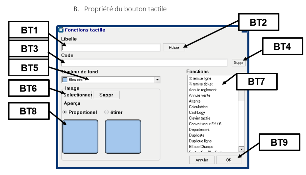 1. Donner un nom au bouton dans la zone « Libellé » [BT1]. Les changements se voient dans l’aperçu [BT8]