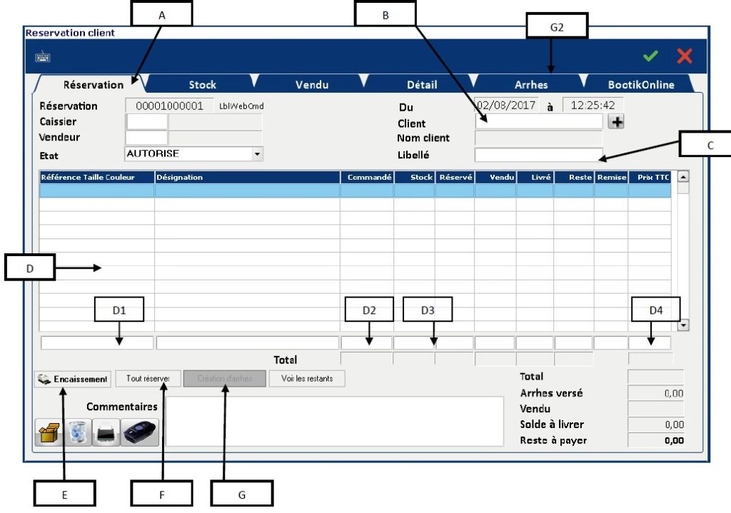 [G] Bouton création d’arrhes : pour attribuer des arrhes à la réservation (avec l’onglet arrhes [G2]).